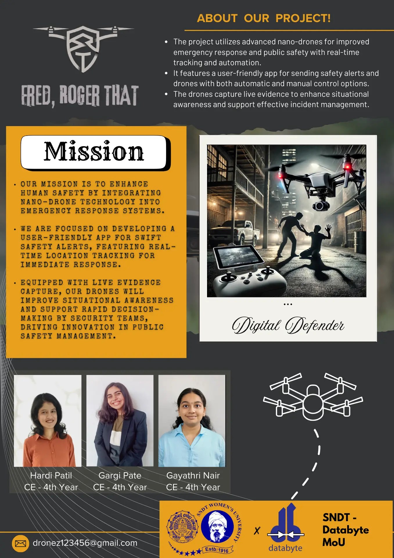 A project focused on integrating nano-drone technology into emergency response systems to enhance public safety. It includes a user-friendly app for swift safety alerts, real-time tracking, and drone live evidence capture. The system supports effective incident management and rapid decision-making with both automatic and manual control options.