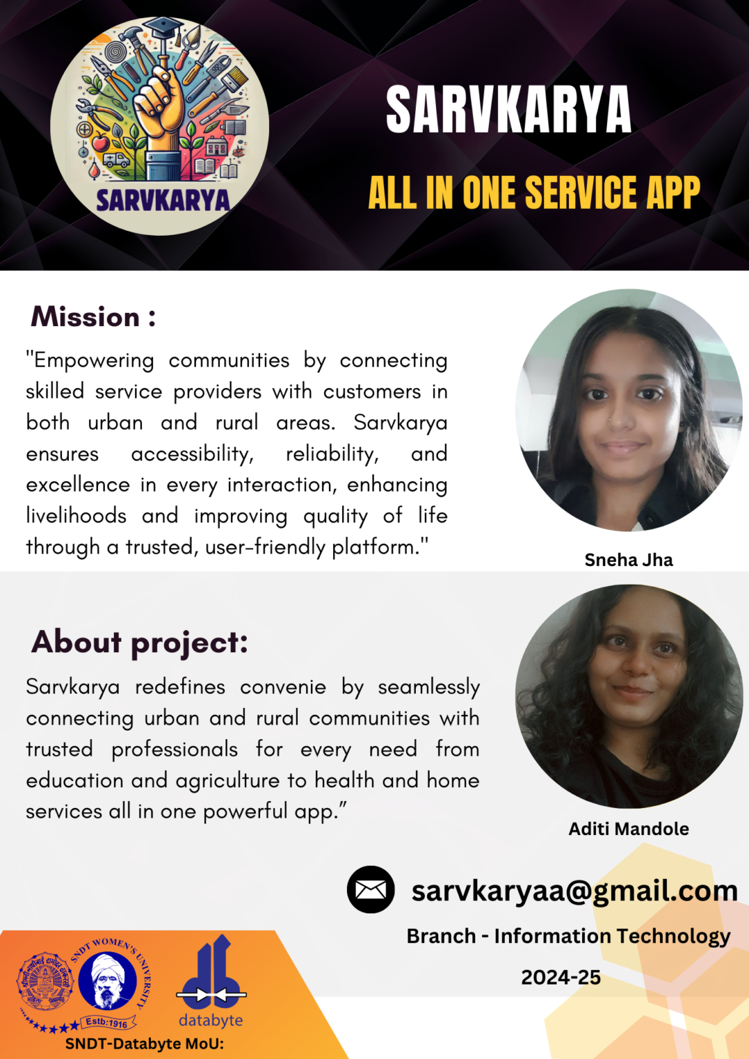 Sarvkarya, a versatile service app launched for the 2024–25 academic year, aims to bridge urban and rural communities by connecting them with skilled professionals. Whether you need help with education, agriculture, health, or home services, Sarvkarya promises accessibility, reliability, and excellence. Developed by SNDT Women’s University and Databyte, this app redefines convenience. For more details, contact sarvkaryaa@gmail.com.